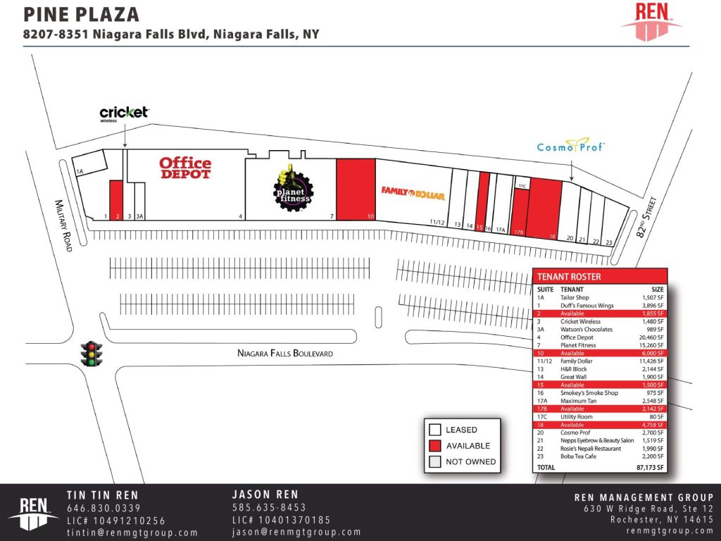 Pine Plaza is located in the Epicenter of Niagara Falls Primary Retail Corridor within Immediate proximity to Fashion Outlets of Niagara Falls, Walmart, Sam’s Club, Wegmans etc. Hard corner location at Military Rd & Niagara Falls Blvd with immense traffic counts of 56k VPD. Every single unit has great visibility. No dead space.